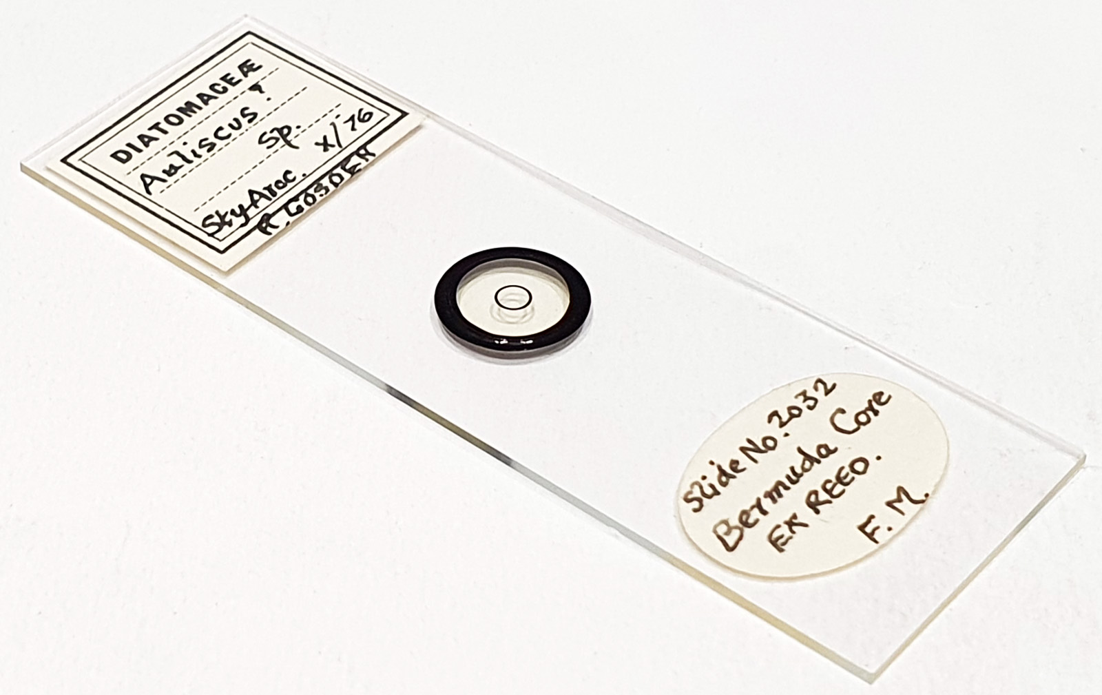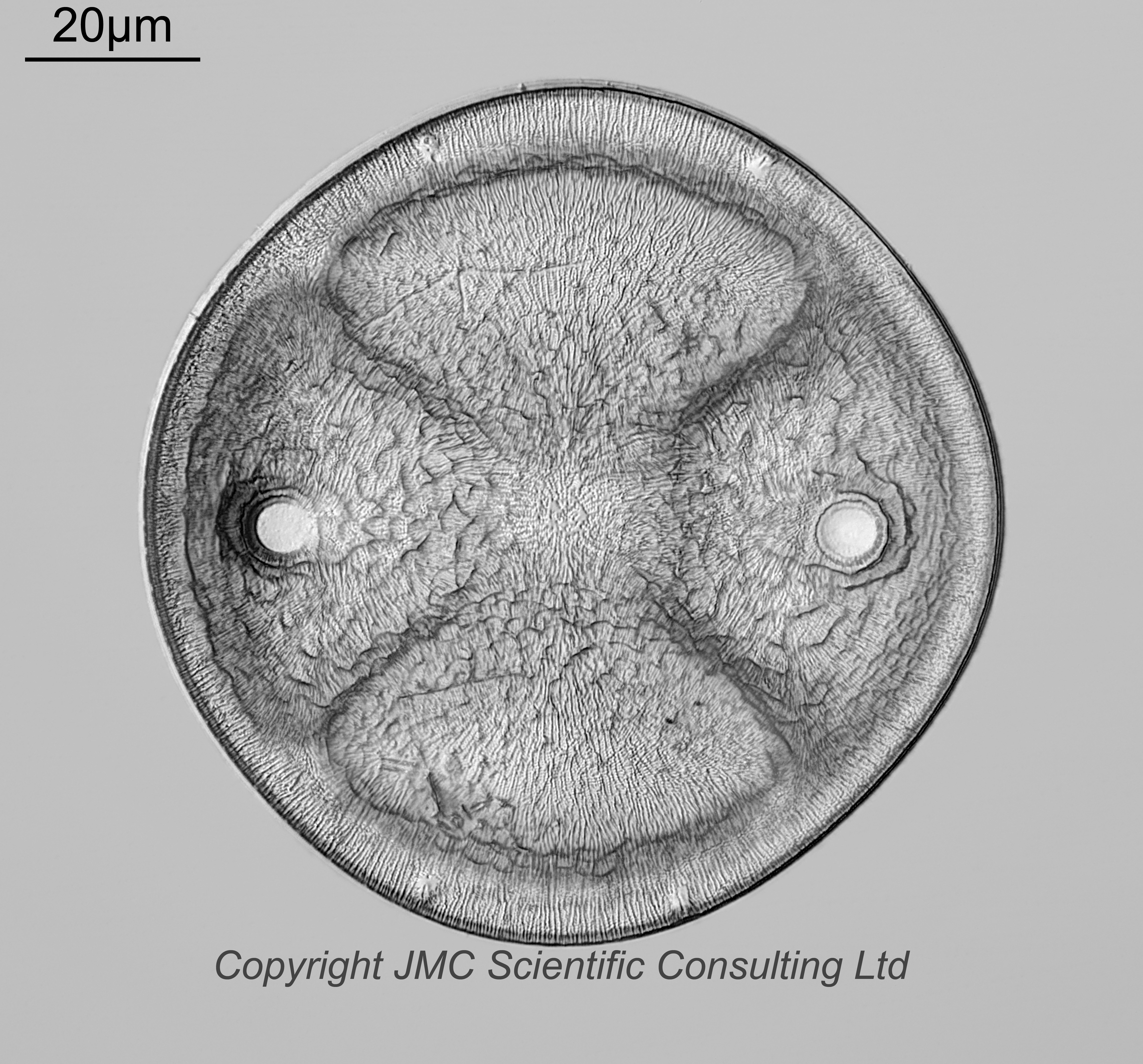 A fascinating slide labelled as Auliscus sp. from Bermuda Core, Ex Reed. Single example on the slide. Fossil marine material. Mounted in Styrax/Aroclor, and dated October 1976. Prepared by Richard Gosden. Olympus BHB microscope using 450nm LED light. 63x Leitz Pl Apo NA 1.4 objective, oil immersion. Olympus Aplanat Achromat condenser, oil immersion, oblique lighting. 2.5x Nikon CF PL photoeyepiece. Monochrome converted Nikon d850 camera. 116 images stacked in Zerene (Pmax). A very 3D shape. Quadrants at 3 and 9 o’clock (with the ocelli) are raised above the rim, those at 6 and 12 are below the rim. Features (rimoportulae?) at 11 and 1, and 5 and 7.